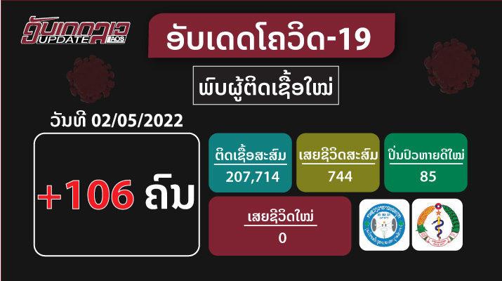 2 ພຶດສະພາ 2022 ກວດພົບຜູ້ຕິດເຊື້ອໃໝ່ທັງໝົດ 106 ຄົນ, ໃນນັ້ນຕິດເຊື້ອ ພາຍໃນ 96 ຄົນ ແລະ ຕິດເຊື້ອ ນຳເຂົ້າ 10 ຄົນ ເຊິ່ງລາຍລະອຽດມີດັ່ງນີ້: