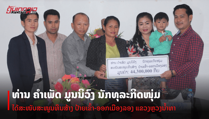 ທຶນສະໜັບສະໜູນໃນການປະກອບສວນ ສ້າງປ້າຍເຂົ້າ-ອອກເມືອງລອງ ໃນຄັ້ງນີ້ ມູນຄ່າທັງໝົດ 44,300,000 ກີບ ເພື່ອນໍາໃຊ້ເຂົ້າໃນການກໍ່ສ້າງປ້າຍເຂົ້າ-ອອກເມືອງລອງ ຈຸດຊາຍແດນ ລະຫວ່າງ ເມືອງລອງ-ເມືອງສິງ ຂະໜາດ 5.7×5 ແມັດ ທີ່ມີຮູບແບບ ລັກສະນະເປັນເອກະລັກຂອງທ້ອງຖິ່ນ ມອບໂດຍ ທ່ານ ຄໍາເພັດ ມູນນິວົງນັກທຸລະກິດໜຸ່ມ ບ້ານຫ້ວຍຫົງ ເມືອງສີສັດຕະນາກ ນະຄອນຫຼວງວຽງຈັນ ຮັບໂດຍ ທ່ານ ນາງ ຈັນຄໍາ ທໍຄໍາເໝົາ ກໍາມະການປະຈໍາພັກເມືອງ ຮອງເຈົ້າເມືອງ ຜູ້ຊີ້ນໍາຂົງເຂດວັດທະນະທໍາ-ສັງຄົມ ໂດຍຊ້ອງໜ້າກັບຜູ້ເຂົ້າຮ່ວມເປັນສັກຂີພິຍານ ໂອກາດດັ່ງກ່າວ ທ່ານ ນາງ ຈັນຄໍາ ທໍຄໍາເໝົາ ກໍາມະການປະຈໍາພັກເມືອງ ຮອງເຈົ້າເມືອງ ກໍ່ໄດ້ສະແດງຄວາມຍ້ອງຍໍຊົມເຊີຍ ແລະ ຂອບໃຈມາຍັງ ຜູ້ໃຫ້ການສະໜັບສະໜູນ ແລະ ຫວັງຢ່າງຍິງວ່າຈະໄດ້ຮັບການສະໜັບສະໜູນຈາກທ່ານອີກໃນຄັ້ງຕໍ່ໄປ.